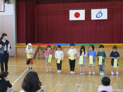 最後には、聞いてくれたお礼に、図書委員会の児童が作ったメダルを園児の皆さんにプレゼントしました。