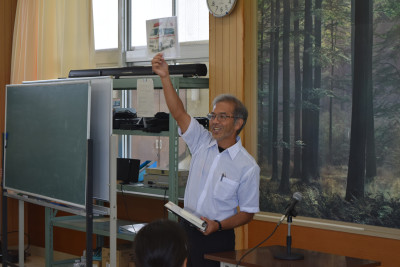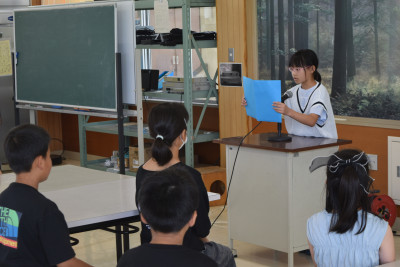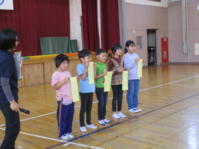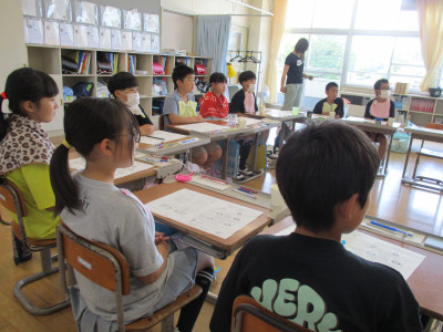 1年生教室では、自分が考えたお話をみんなに発表していました。上手にお話ができるようになりました。