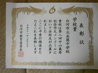 2019年2月18日 10時21分第8回 中山義秀記念作文コンクールにおいて、五箇中学校が、「学校賞」を受賞しました。