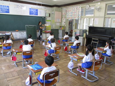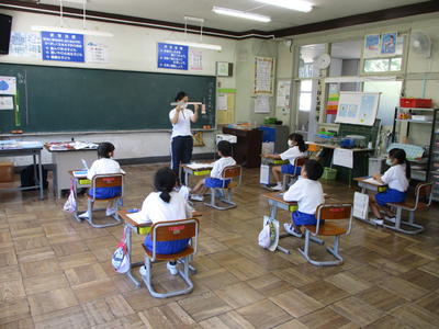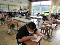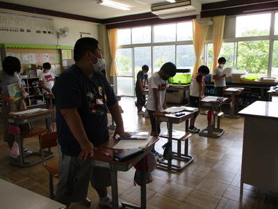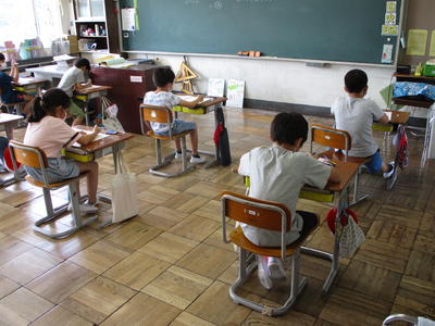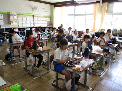 残った1~4年生の子どもたちは、午前中にしっかり勉強した後、昼はお待ちかねのお弁当です。