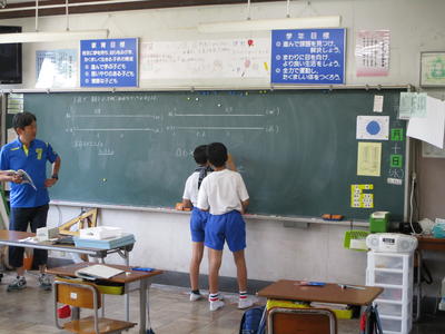6年生の授業の様子を見ると、ホワイトボードには今日のAIMが書かれ、その達成に向けた活動が行われていました。