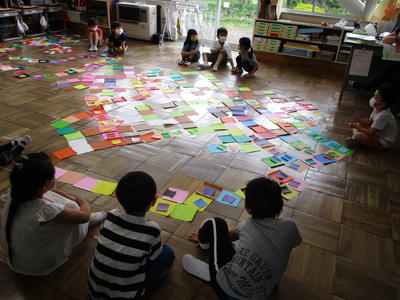 【1年図工】今日のAIMは、「色をきれいに並べる」です。