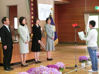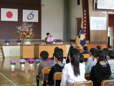 大屋小校歌の2番に「大屋のよい子と育ってこおう」という歌詞があります。大屋の子どもたちは、素直でさわやかでそして子どもらしさがあふれている子どもたちです。まるで、歌詞をそのまま目標にして生活をしているようです。今日の入学式で6名の1年生を迎え、大屋のよい子は54名になりました。今は、不安な気持ちの1年生とご家族の皆様だと思います。私たち教職員はもちろん、学校のお兄さんやお姉さんに遠慮なくご相談ください。