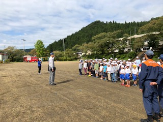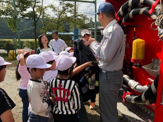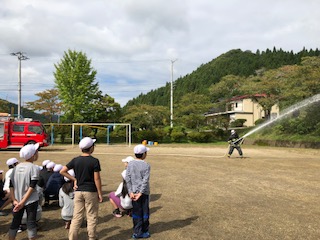 避難の仕方を練習した後は、白河消防署大信分署から3名の講師をお招きして、消火練習と放水による消火見学をしました。最後は、消防服やホースに、直接触れる体験をしました。