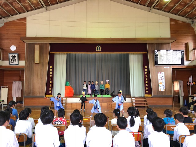 19日(金)は、学習発表会。当日は、演技に集中しますで、予行練習となる校内学習発表会。これまで、各学級で児童と担任が着々と準備をしてきました。劇、ダンス、歌、合奏などがありますが、毎年恒例の6年生による創作劇もあり、盛りだくさんです。