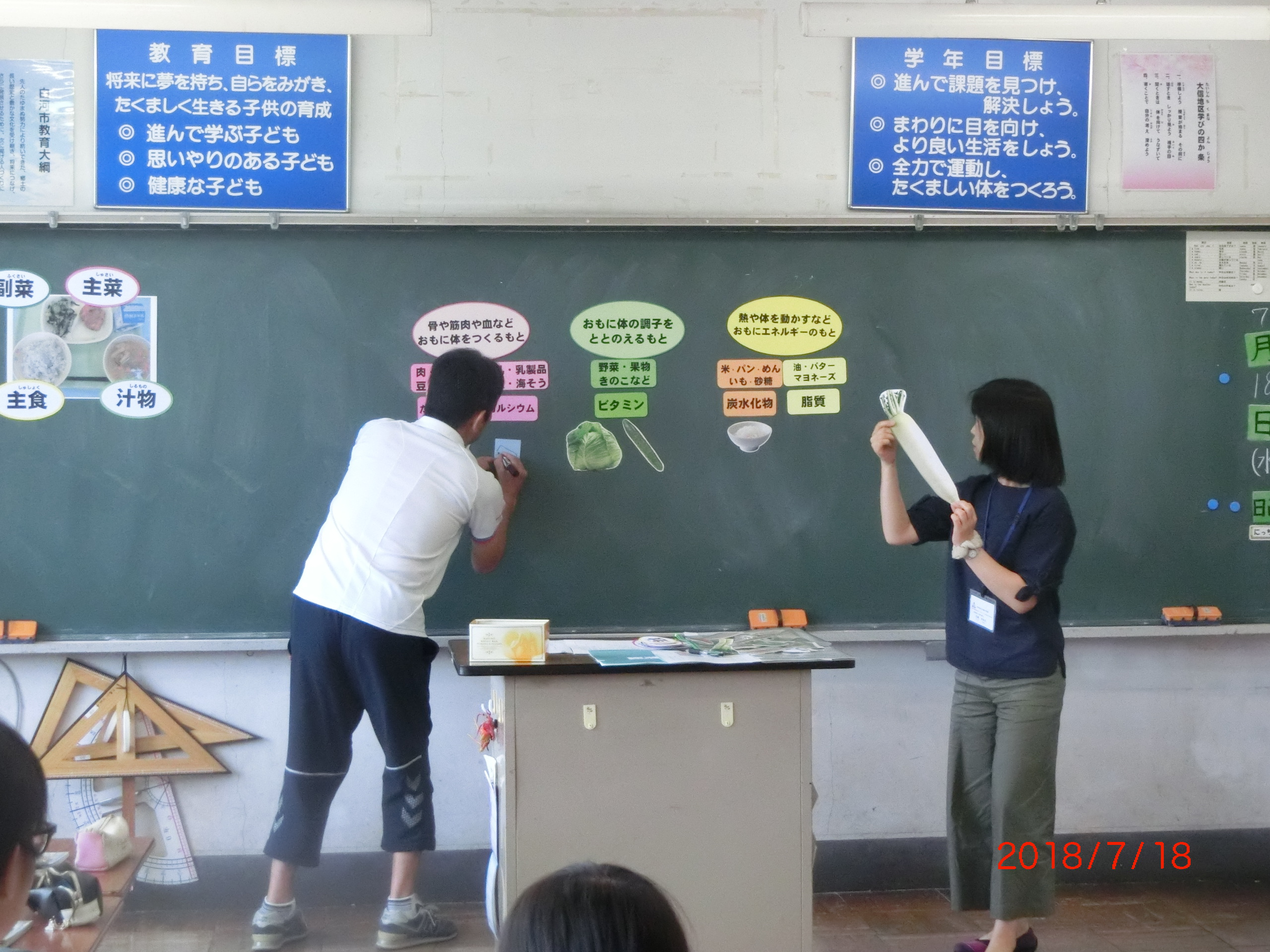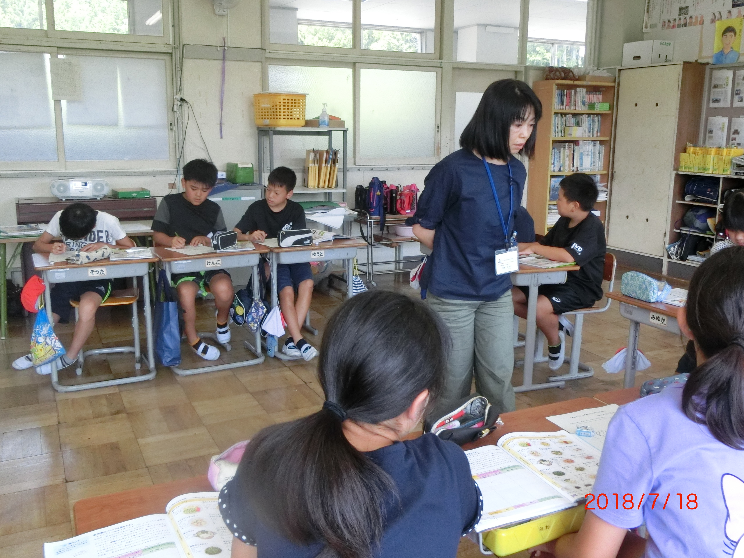 大信中学校の栄養教諭に来校していただき、6年生対象に食に関する指導を行っていただきました。今回は、夏休みの宿題にもなる「ふくしまっ子ごはんコンテスト」に向けてバランスの良い食事作りについて指導をしていただきました。授業の後は、各クラスの給食の様子も参観していただきました。