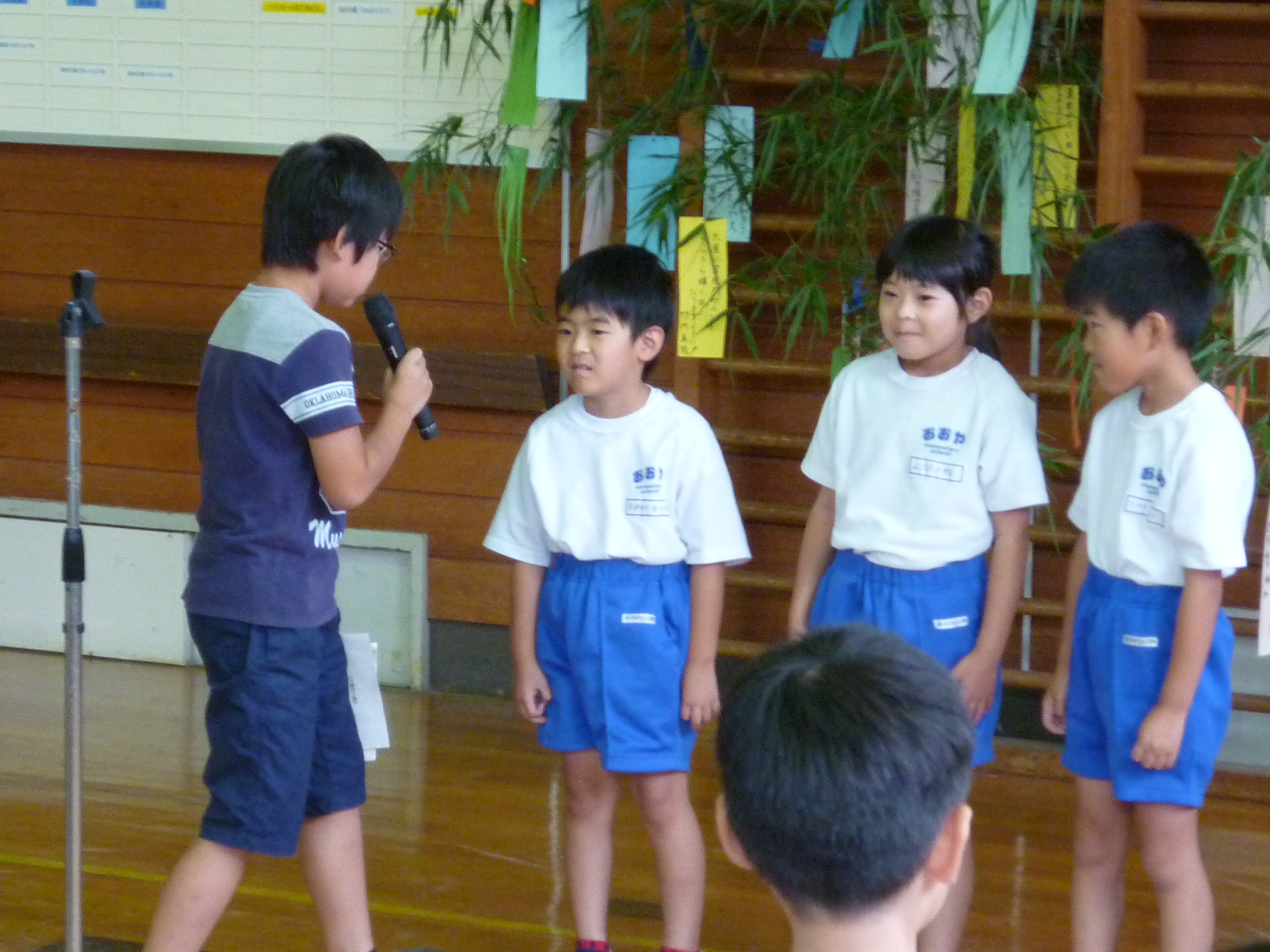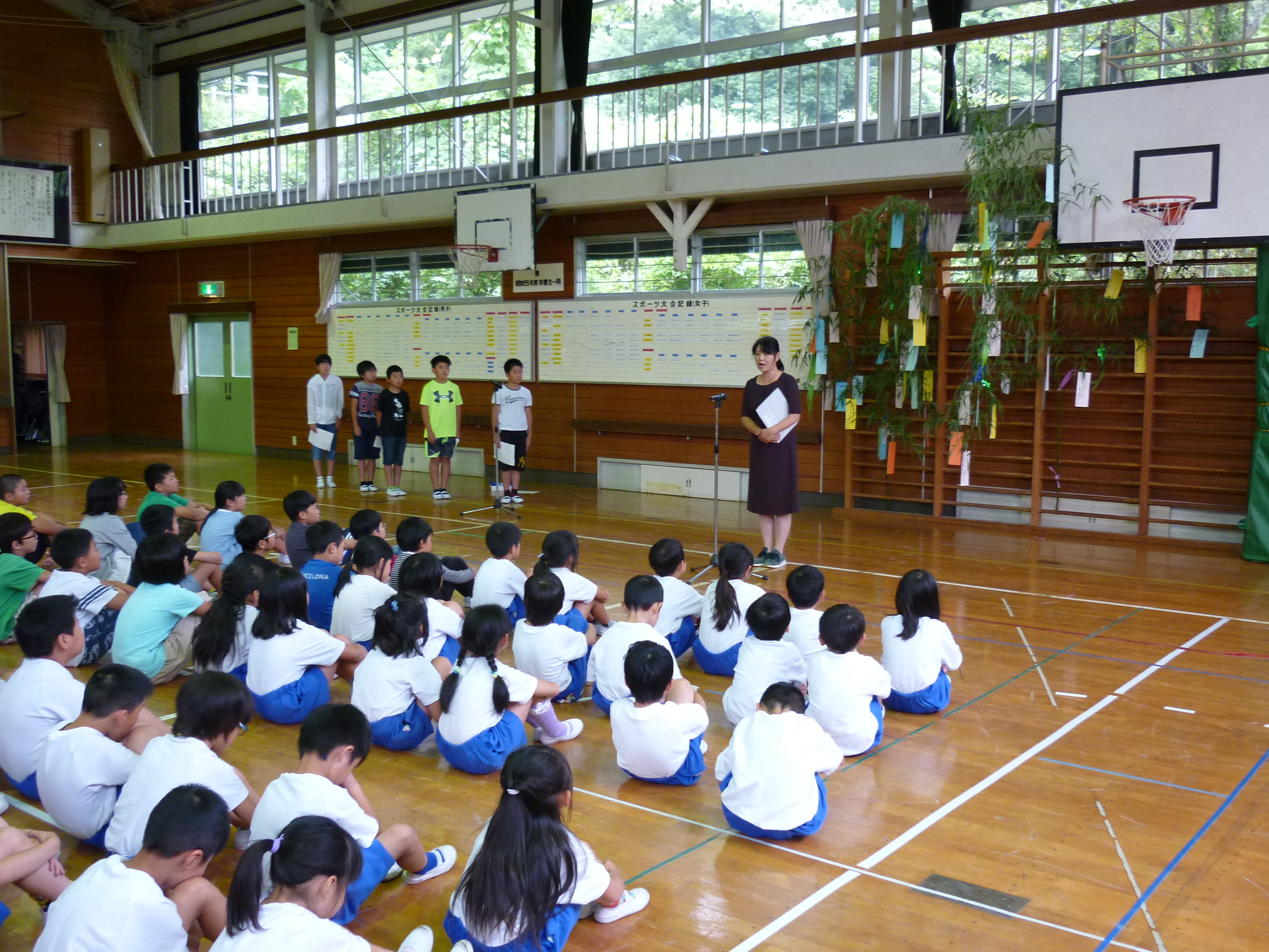 業間に、七夕集会を開催しました。今回は、放送委員会の担当です。児童のお願い事をかいた短冊は、PTA副会長さんが雨の中、届けてくださった竹に飾り付けました。短冊の願い事は、インタビュー形式で児童が発表しました。あいにく明日も雨となりそうですが、雨のために星空はみられなくても、地域の方の温かな心に触れる機会になった七夕集会でした。