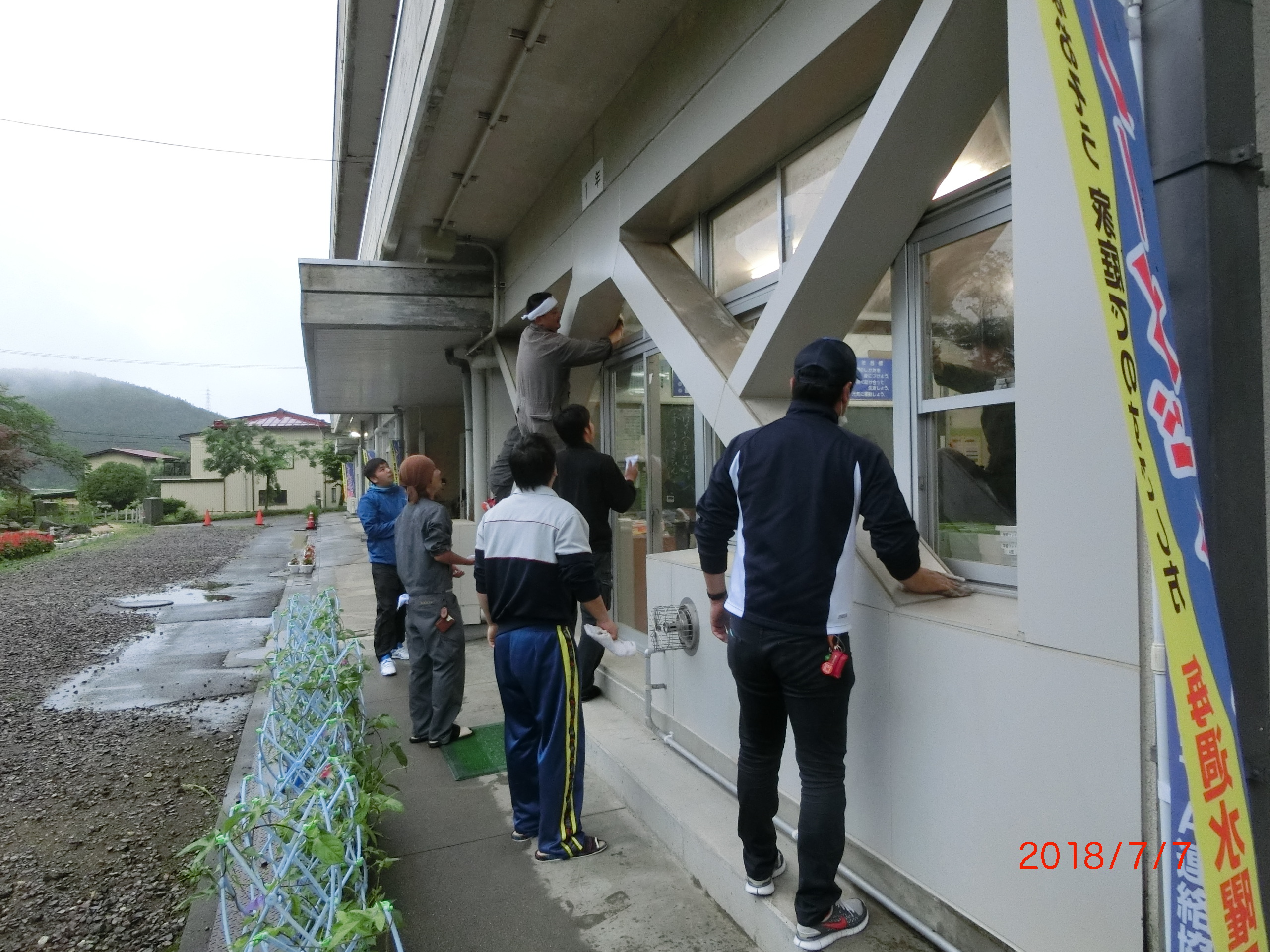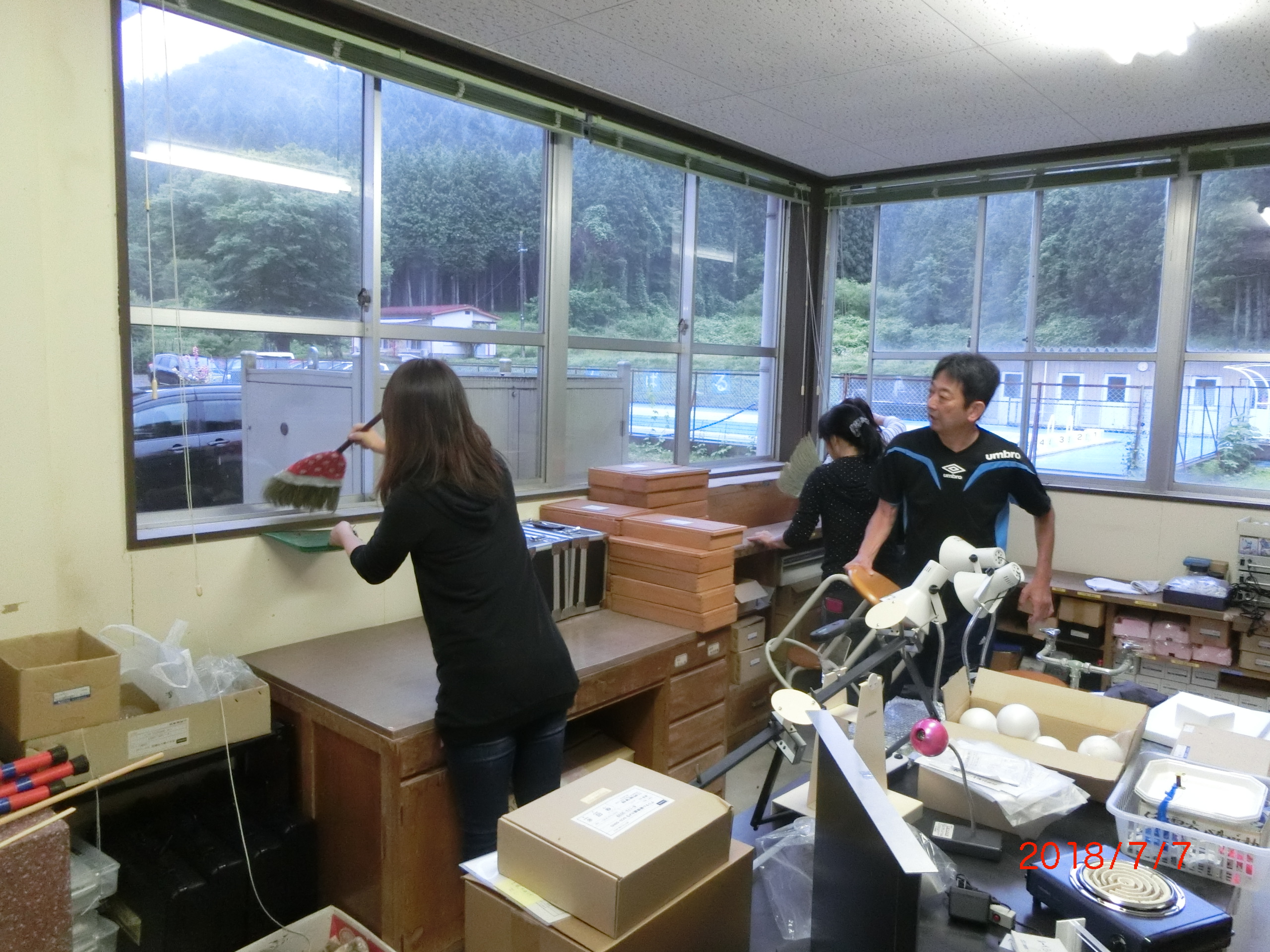 今日は年二回実施する奉仕作業の日。早朝6時からの予定で、保護者の皆様にお集まりいただきましたが、あいにくの雨のため、校舎内の美化作業をしていただきました。普段の掃除で手が届かないガラス磨きや、特別教室の掃除をお手伝いいただきました。長年手を付けていない場所もあり、皆様にはご苦労をおかけしましたが、快くご協力いただきありがとうございました。皆様のお力をいただき、見違えるほどきれいになりました。これからお仕事に行かれる方、草刈り機を準備していただいた方などもいらっしゃり心より感謝いたします。2回目は、夏休み最後になりますが、次回もご協力をよろしくお願い致します。ありがとうございました。