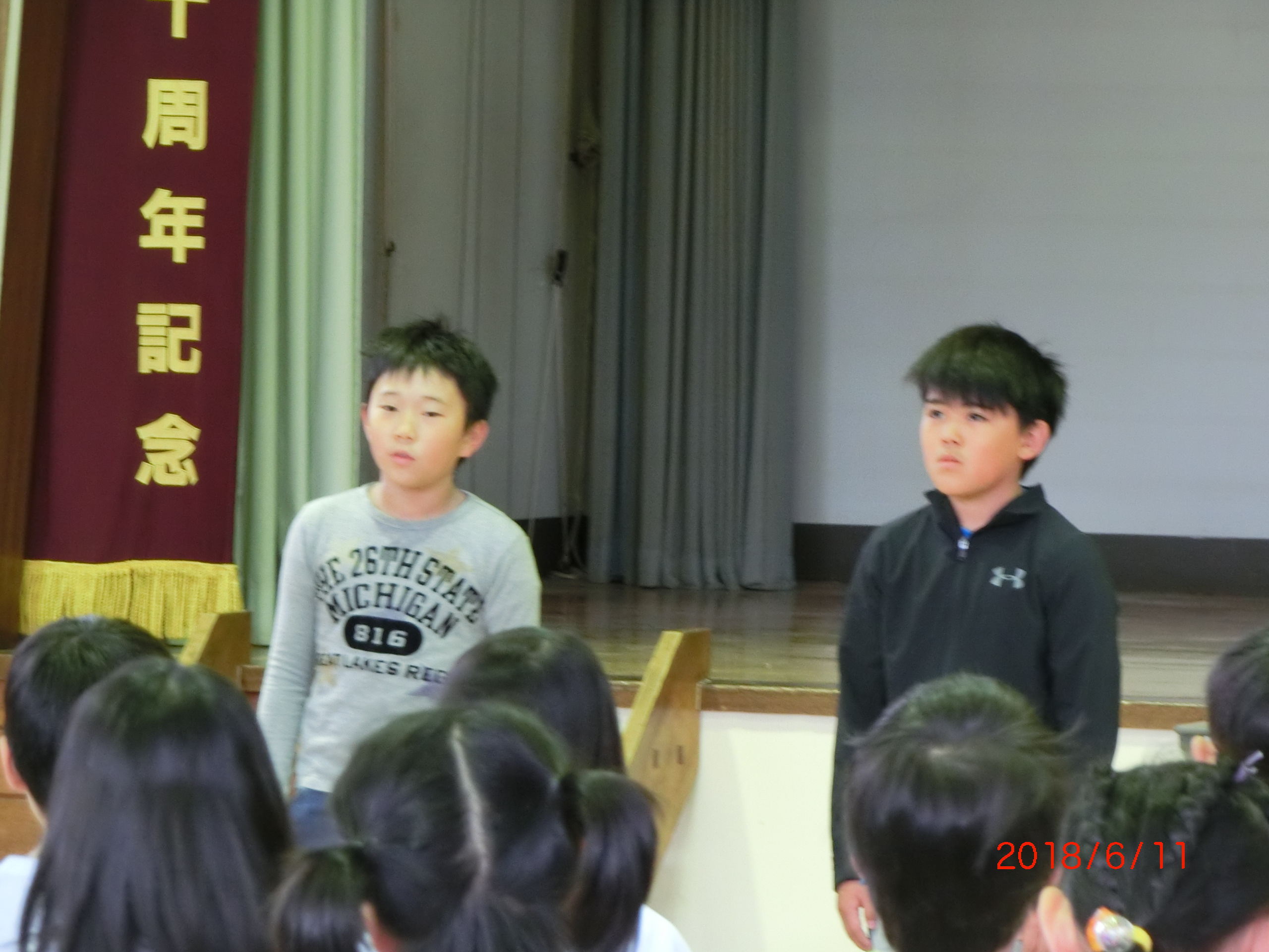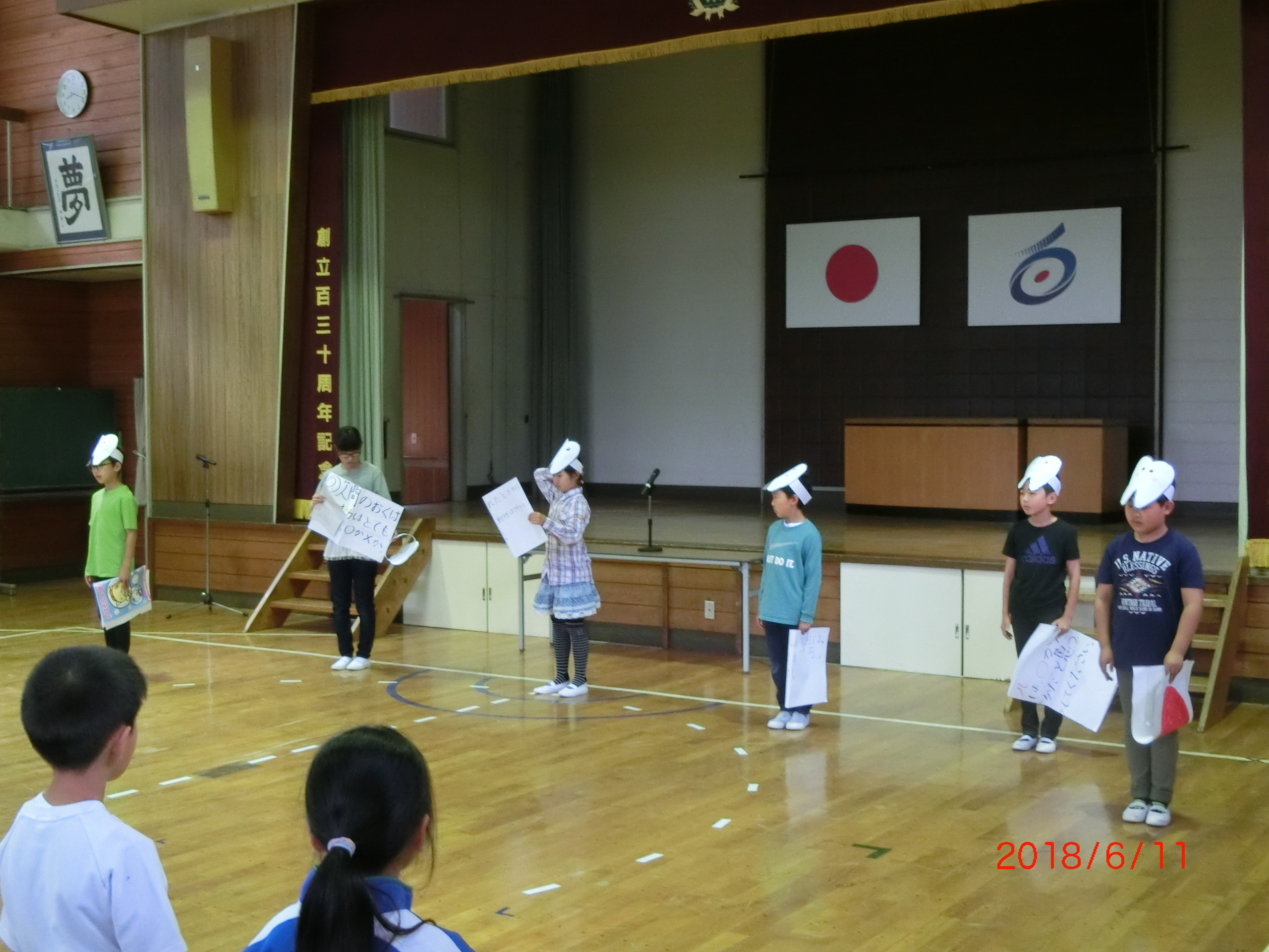 月曜日の朝は、集会です。今朝は、保健給食委員会が担当です。先週の6月4日から10日までは「歯と口の健康週間」でしたが、今日は、本校でもよい歯の児童を表彰しました。また、委員の皆さんが、歯に関するクイズを出してみんなで考えることもできました。