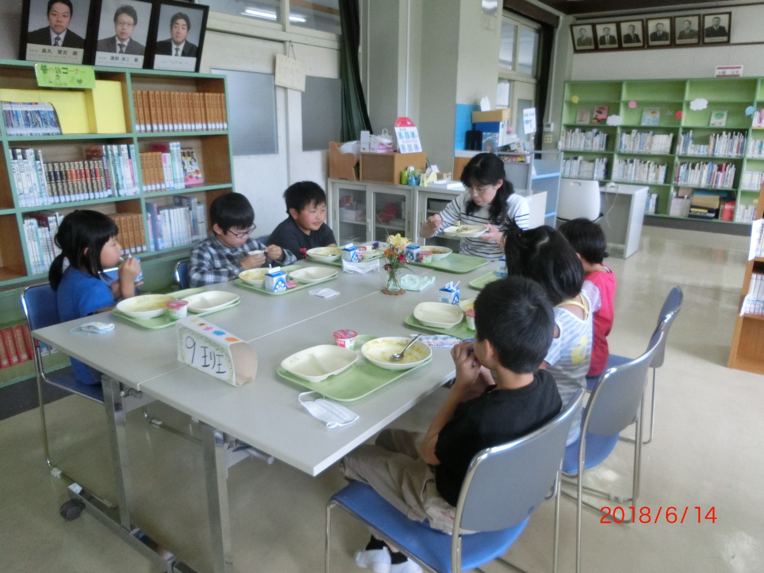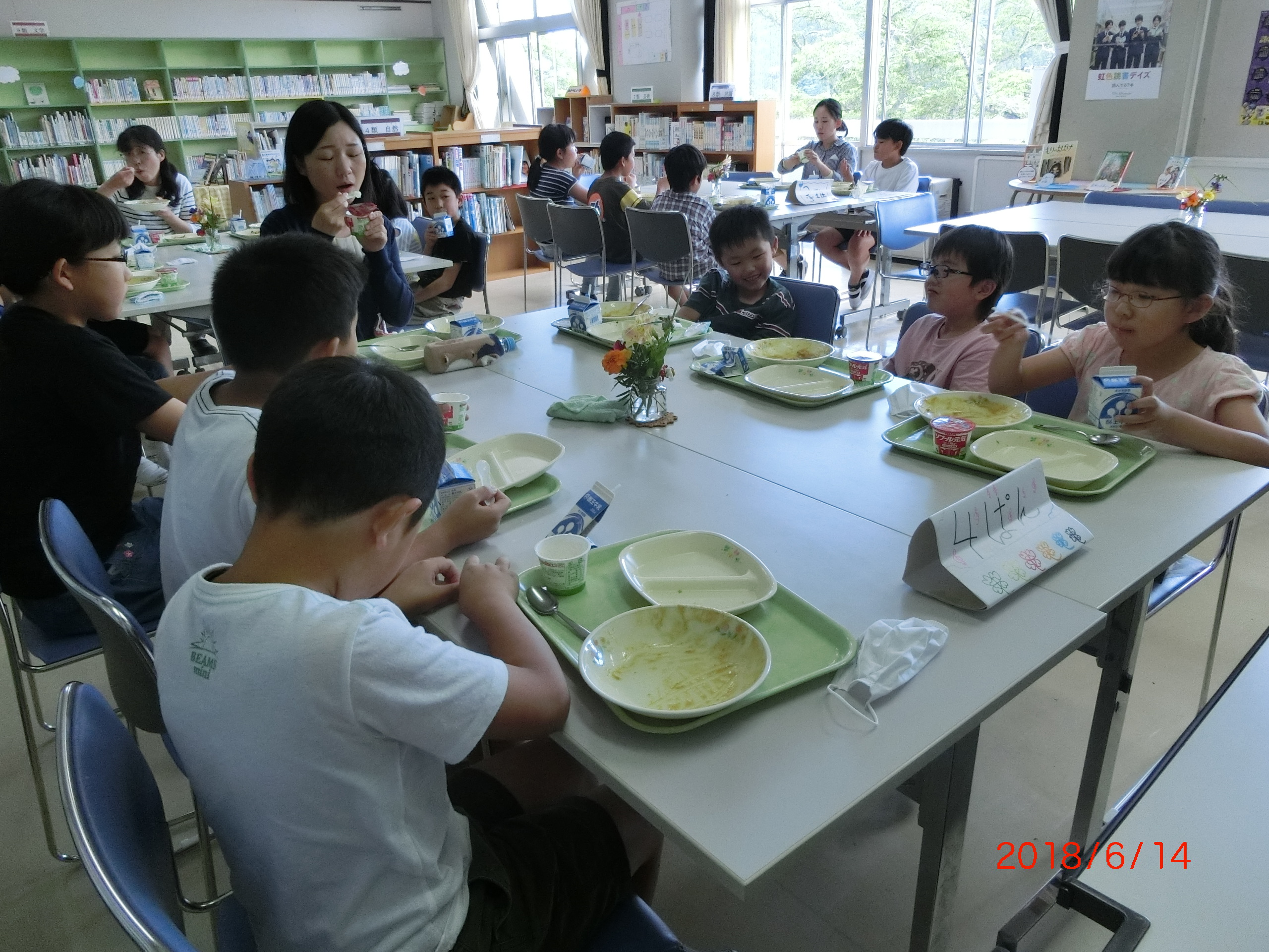 12日からの3日間、縦割り班で給食を食べる「交流給食」を行いました。一度に、全員での食事は難しいので、縦割り班ごと1回ずつの実施となりました。いつもは、学級の友達と一緒に食べていますが、毎日の清掃を共に行うメンバーによる縦割り班での給食は、今年度初めてです。異年齢のグループによる食事の時間は、上級生が面倒を見ながら、また、楽しい会話をしながらあっという間に過ぎました。