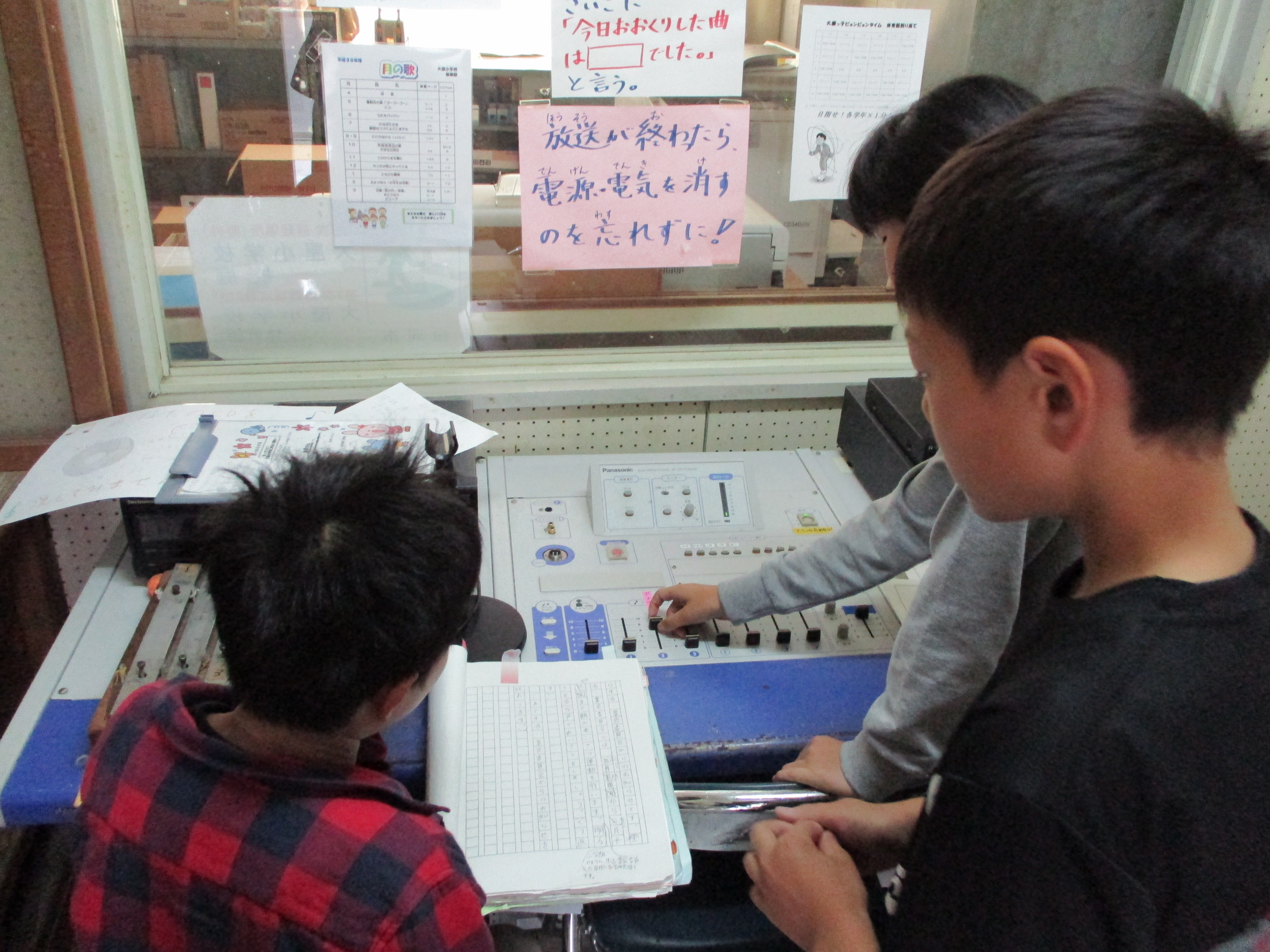 朝7時53分。校内放送が入ったので、放送室をのぞいてみました。すると、3名の生活・集会委員が、「あいさつ運動」の呼びかけをしていました。
