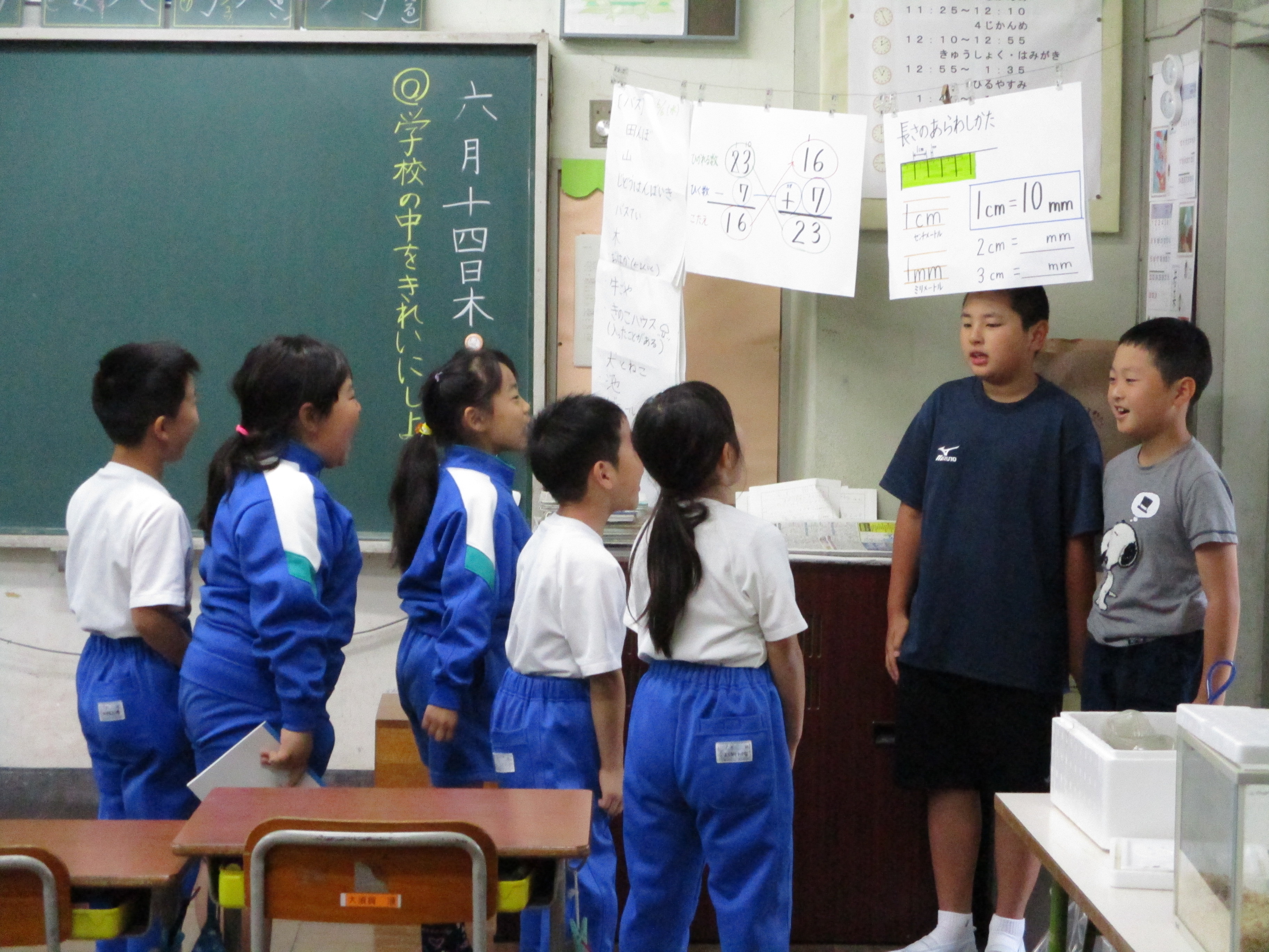 まずはじめに、1年教室。前の入り口から2人の委員が教室に入り、声をそろえて「おはようございます」の大きなあいさつ。初めて経験する1年生はびっくりしながらも大きな声であいさつのお返しをしました。