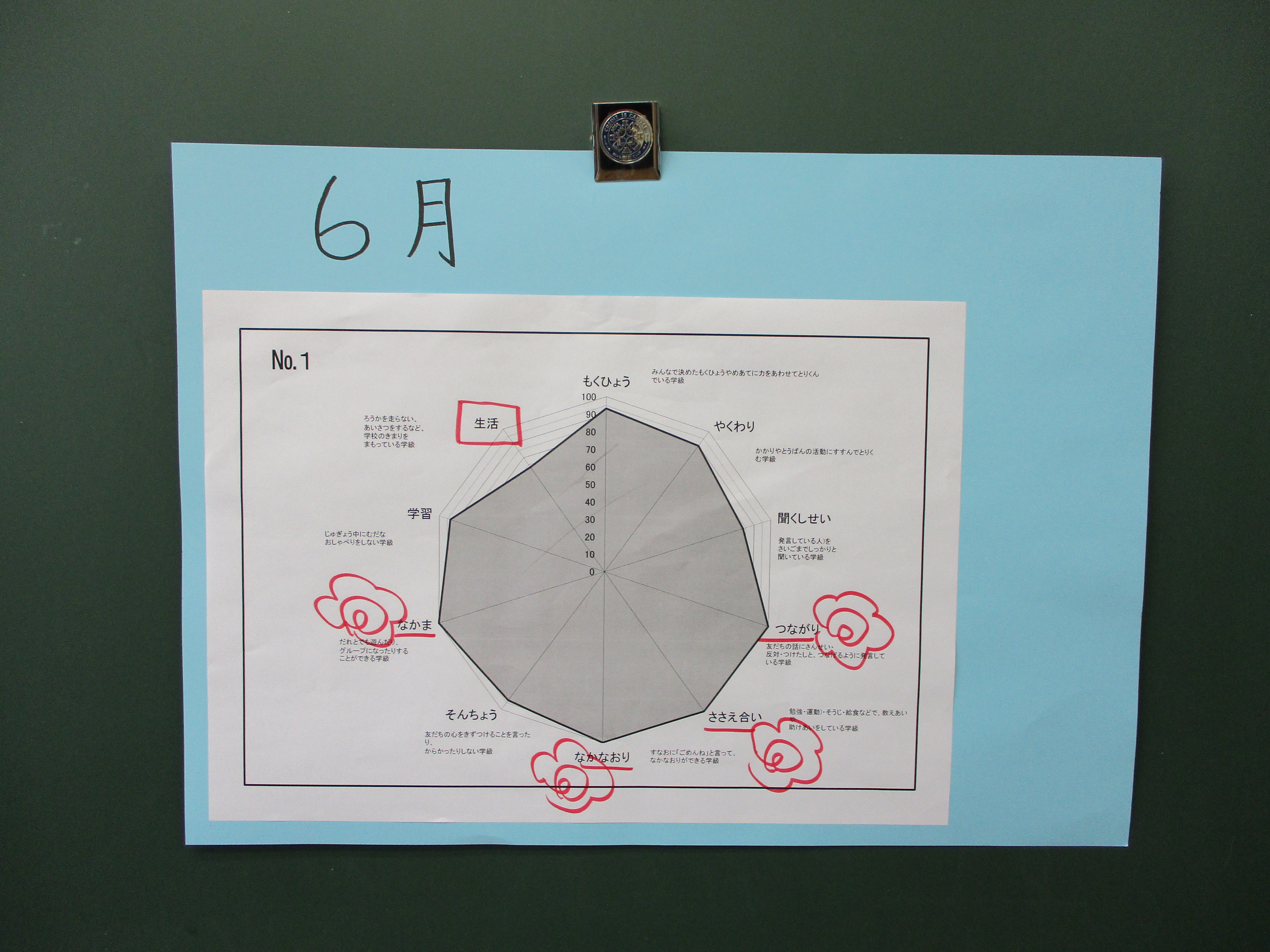 今朝、4年教室の黒板に、次の写真にある紙が貼ってありました。どうやら、これは、6月の学級力アンケートの結果のようです。「つながり」「支え合い」「なかなおり」「なかま」に花丸がついていました。やはり、いつも明るくさわやかな4年生。そして、同時に、よりよくなるための次の課題も見つけたようです。大屋っ子は、自分の学習や生活を振り返り、何が課題か、どのように解決していくかを考えられる子ども達です。