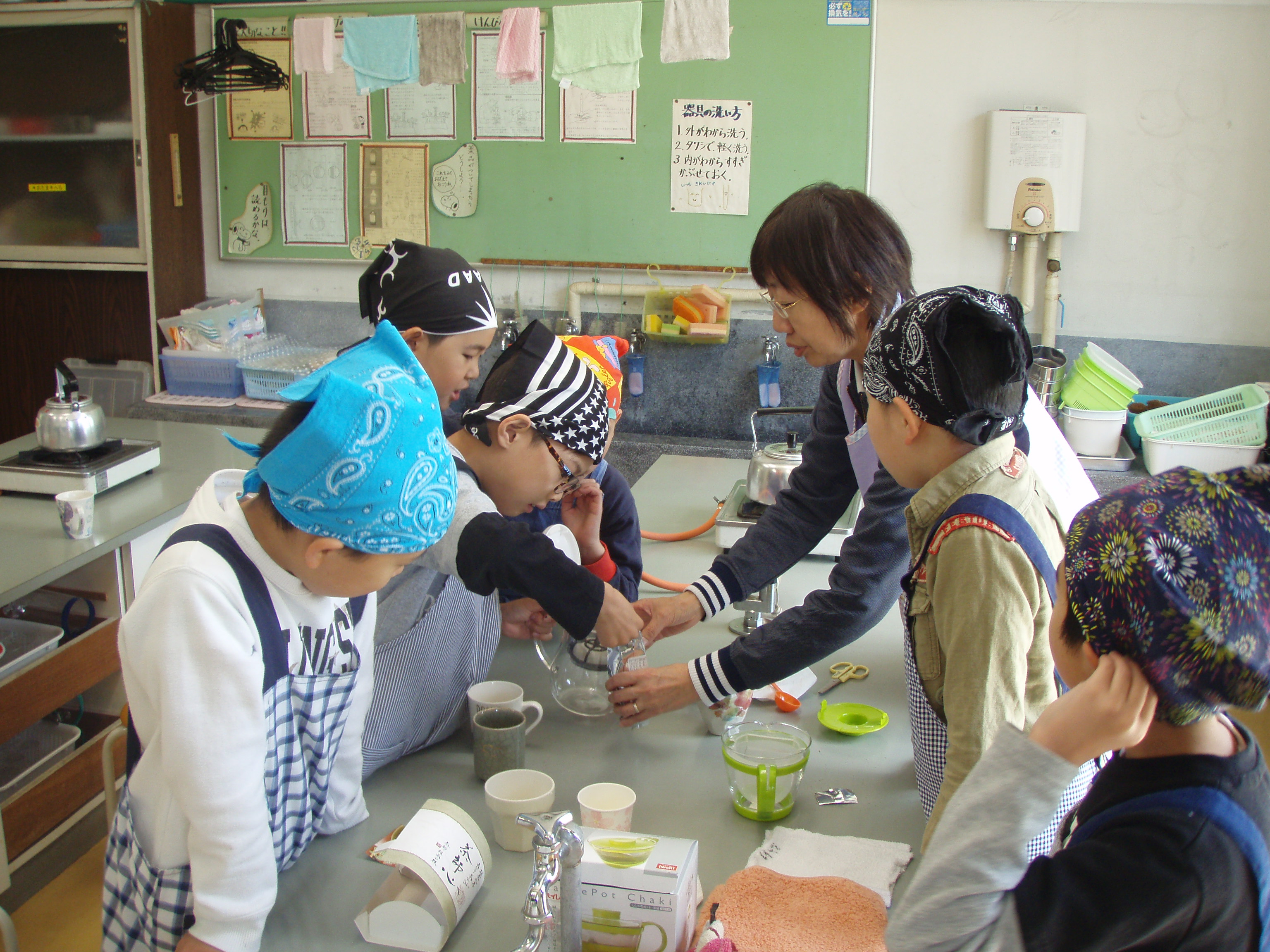 今日の5年生の家庭科では、「お茶の入れ方」を学習しました。ガスの付け方やお湯の沸かし方を学んでから、自分でお茶を入れました。一連の作業を自分でやってみるのは、とても楽しかったようです。児童が入れたお茶を私もいただきました。おいしかったです。ごちそうさまでした。