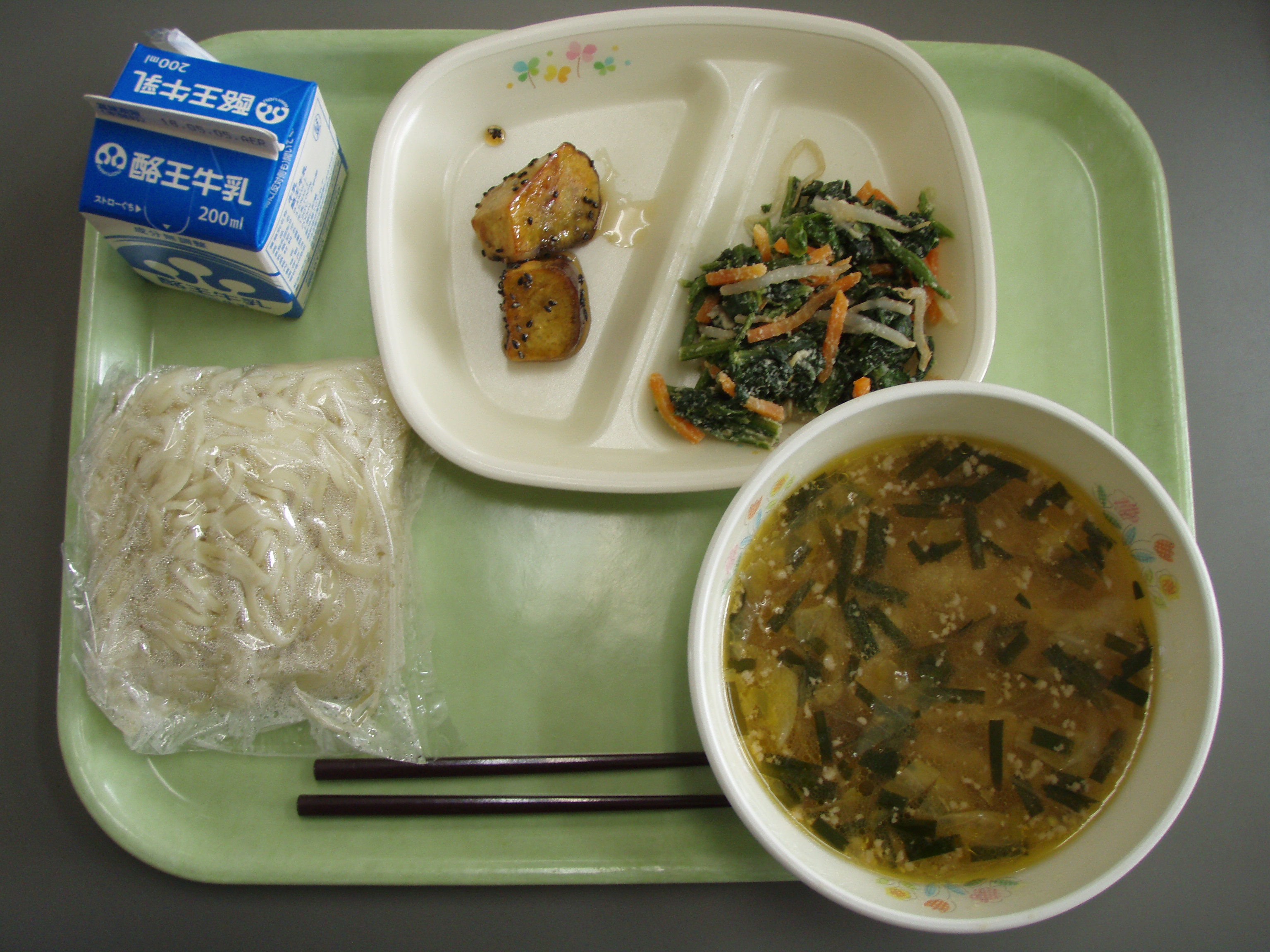 今日は、給食にはじめて「麺」がでました。献立は、「味噌ラーメン、大学芋、ホウレンソウのアーモンド和え、牛乳」です。各教室では、味噌ラーメンに大喜び。さらに、甘くておいしい「大学芋」も大人気。