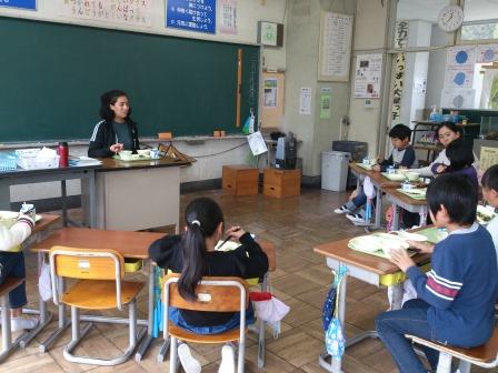 〇2年生 ALTの先生と給食を食べました。アメリカでは花粉症はあるのかなど質問したり