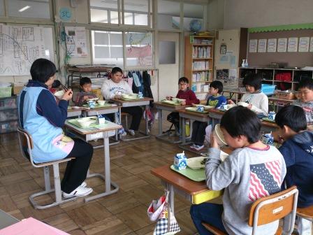 今日は、2年生がALTの先生と、3年生が栄養士の先生と一緒に給食を食べました。それぞれ、いろいろな話題で盛り上がり、楽しく食事をしました。