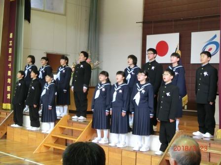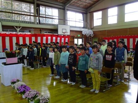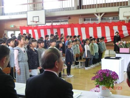 本日卒業式と修了式が行われました。卒業式では、子ども達一人一人がそれぞれが思いを込めて一生懸命練習してきた成果を、見事に表現し、感動的な卒業式となりました。多くの来賓や保護者の皆様の記憶にしっかりと残ったことと思います。式歌は、一人一人の声が美しいハーモニーを響かせていました。修了式では5年生の代表児童が修了証書を授与されました。春休みは、今までのまとめをしっかりやって、次の学年に進級してほしいと思います。