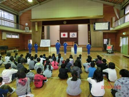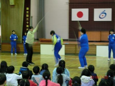 1月22日(月)児童集会が行われました。体育美化委員会によるなわとび記録会に向けての発表でした。なわとびについての模範演技と、ダブルタッチの紹介がありました。また、前年度の記録を紹介し、記録会に向けての意欲を高めました。
