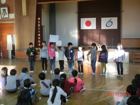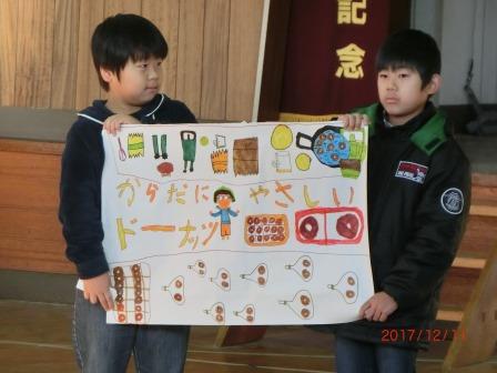 12月11日(月)児童集会が行われました。今回は2年生が今まで学習したことを発表しました。司書さんのお仕事や、ドーナッツづくりについてクイズやイラストで発表し、全校生が楽しく発表を聞きました。