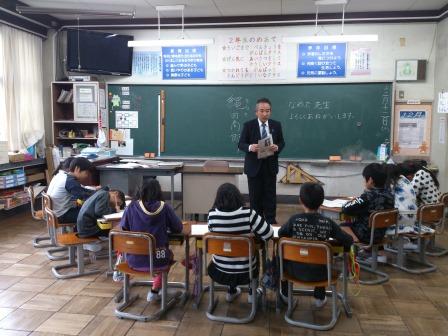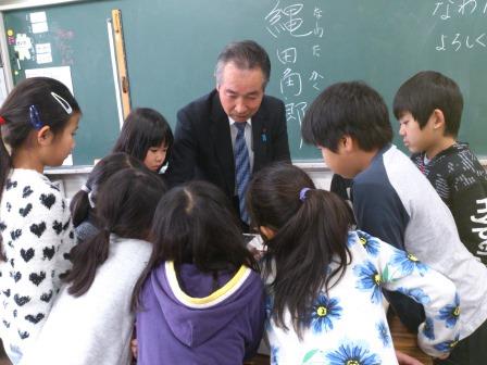 本日2年生で地域を知る授業が行われました。市議会議員の縄田さんを講師に、上小屋の歴史や、子ども達の質問に、ていねいに答えていただきました。また、手作りのログハウスについて、写真を見せてくれ、子ども達はその建て方など興味深く眺めていました。