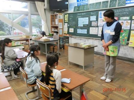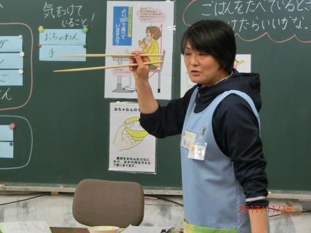 1年生が食事の時の姿勢、茶碗の持ち方、箸の持ち方について、栄養士の先生から教えていただきました。これから成長して社会人になった時に、正しいマナーが身についているといいですね。