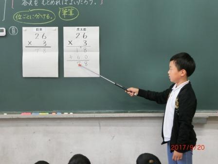 2017年9月27日 18時05分 9月20日(水)校内授業研究会が行われました。3年生の算数で、繰り上がりのかけ算について学習しました。子ども達は、繰り上がりの意味や、かけ算の仕方について真剣に取り組んでいました。