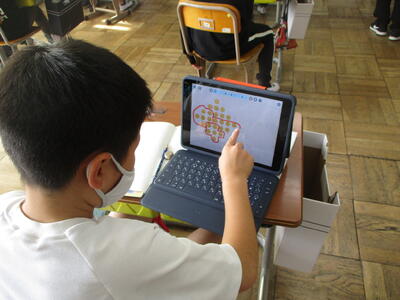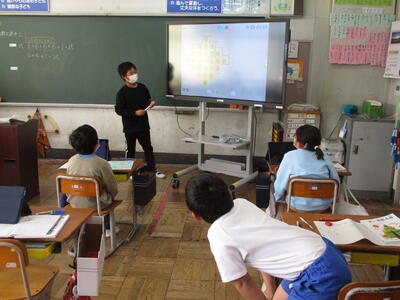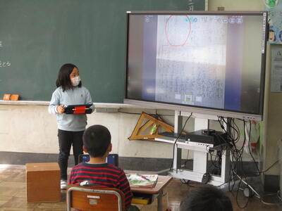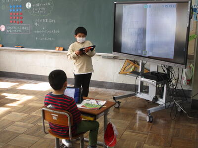 4年生も、タブレットと電子黒板を使って自分の考えを説明しています。