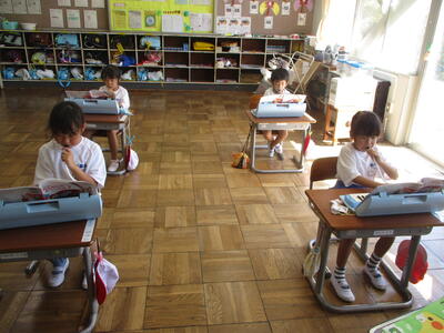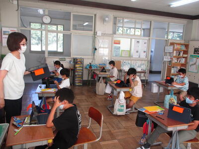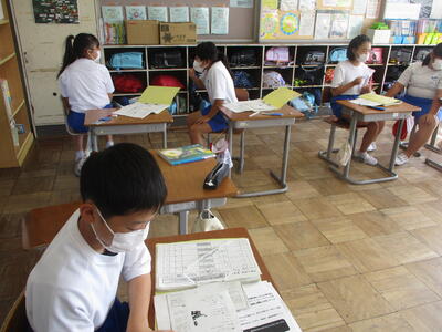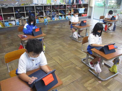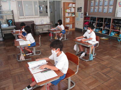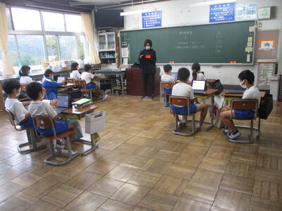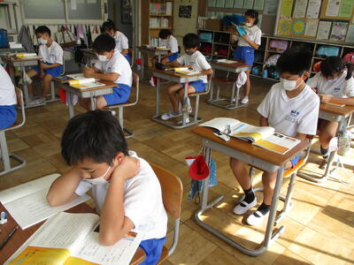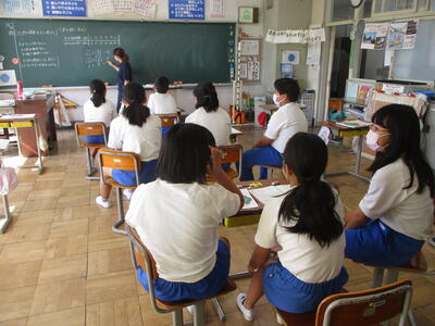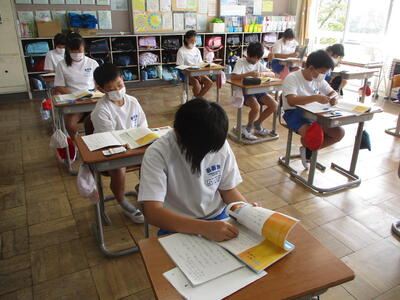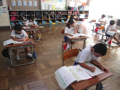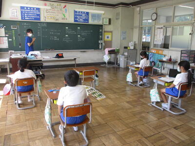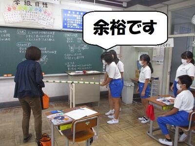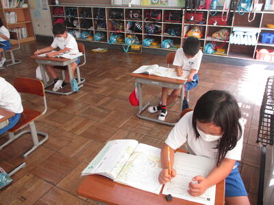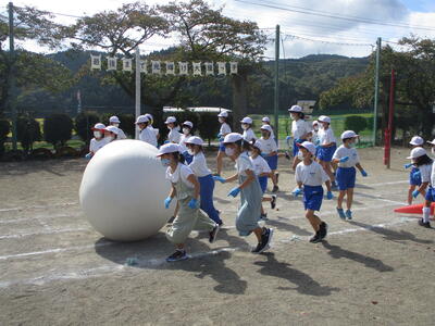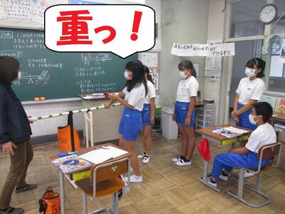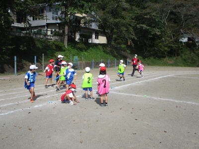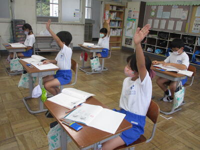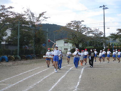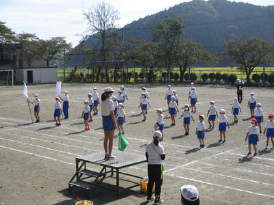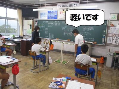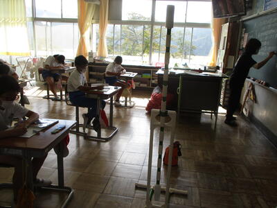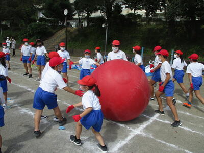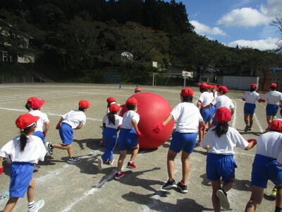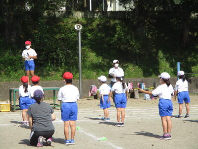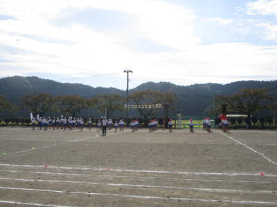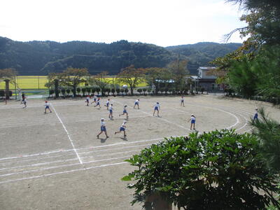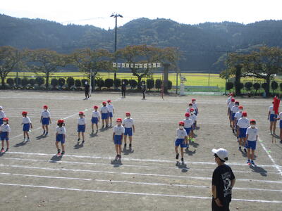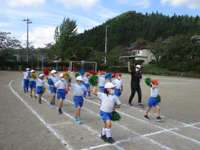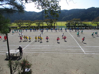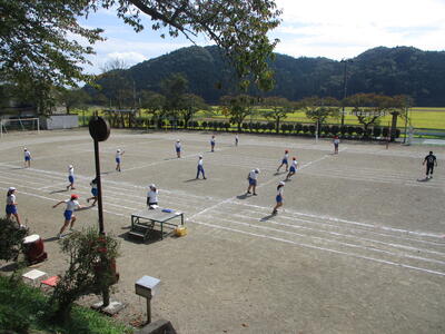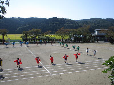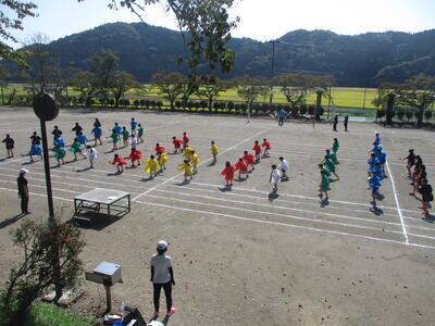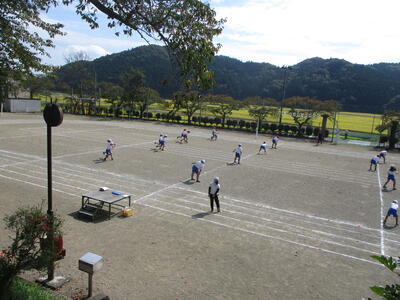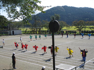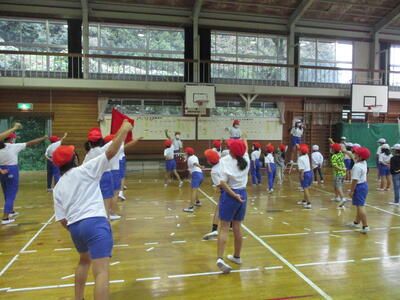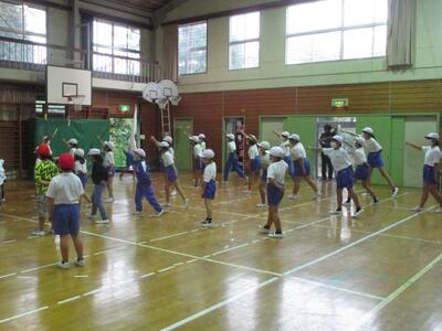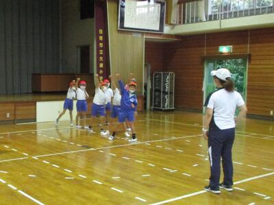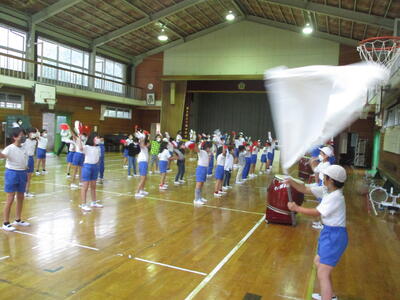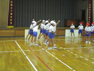 また、3、4年生の体育では、団体競技「大屋タイフーン」のスタート前のかけ声の練習をしていました。