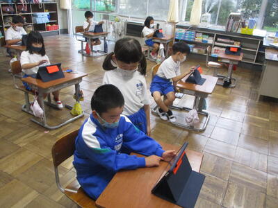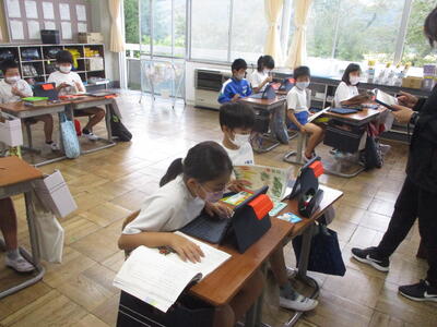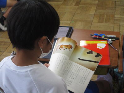 音読をタブレットで録音して、読み方の工夫を確かめています。
