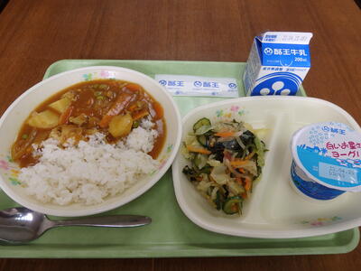 今年度、初めての給食のメニューは、カレーライスでした。海藻サラダとヨーグルトもつきました。1年生も、おいしそうに食べていました。