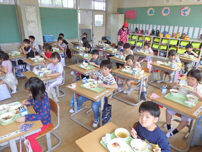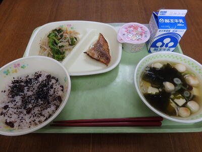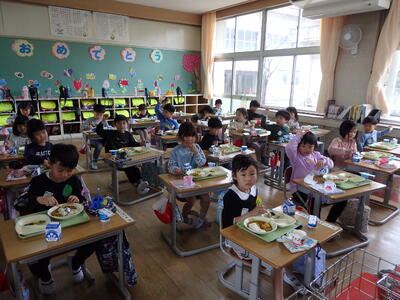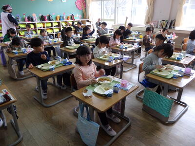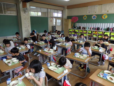 今日の給食は、入学お祝い献立でした。メニューは、お赤飯、赤魚の白醤油漬け、おかか和え、すまし汁、そして、お祝いのデザートもつきました。1年生の子どもたちも、おいしそうにいただきました。