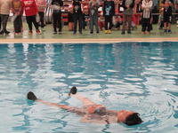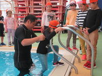 「服を着て水に入る」という初めての経験をした1年生は、水の中だと服が重くなり自由に動けないことなどを自分の体を通して学んだようです。3年生や6年生は、数回経験しているものの、着衣での水難事故でどのように命を守ればよいかを改めて学んでいました。