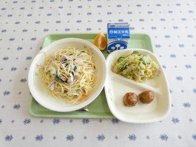 2021年6月15日 17時30分給食で提供されるスパゲッティーは、ソフト麺にソースをかけるのが一般的かもしれませんが、今日の「小松菜クリームスパゲッティー」はこだわりの一品でした。調理場でパスタをゆで、ソースと程よく絡むようオイルをコーティングするという手間のかかる作業を経て作り上げられたものです。こだわりのメニューをいただいて、生徒の皆さんの笑顔があふれる給食の時間となりました。今日も美味しい給食、ごちそうさまでした。