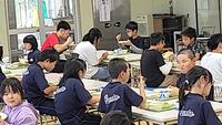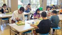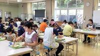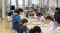 61名が仲良くそろって給食をいただく様子は、とてもほほえましいです。