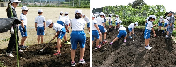 本日も、地域の方に来ていただき、3・4年生が畑の畝づくりをしました。