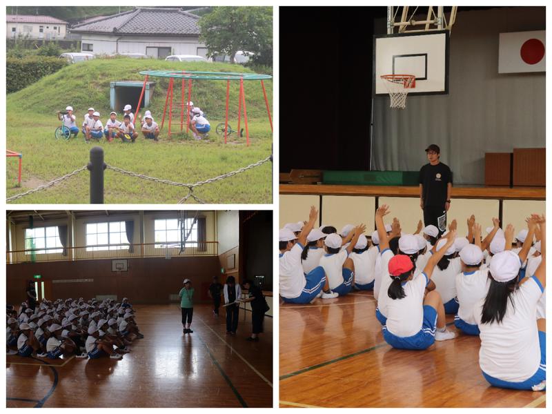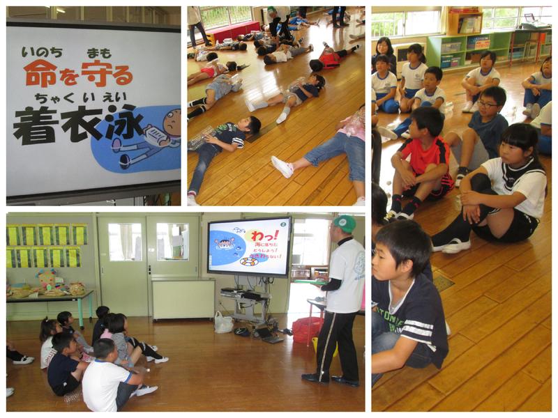7月16日、着衣泳講習(全学年)を行いました。本来はプールでの着衣泳を予定しておりましたが、水温・気温が基準に達しないため、校舎内での講習となりました。