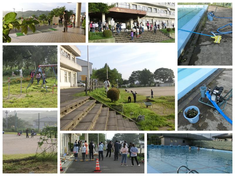 早朝より、53名のPTAの皆様にご協力いただきました。21台の草刈り機もフル稼働して、校舎周りや校庭、