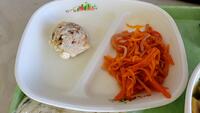 ほうれん草のサラダには、コーンが入っていて彩りよく、そして甘さもあり、ほうれん草が苦手な子どもも食べやすいように工夫されています。