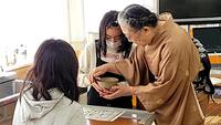 雪の舞う寒い日でしたが、多くの茶道具を準備くださり、着物をお召しいただき、学習ボランティアの方々か来校くださいました。
