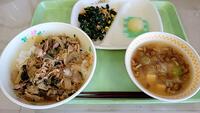 献立は、ぶた丼、ほうれん草のサラダ、なめこ汁、「一口りんごゼリー」、牛乳です。
