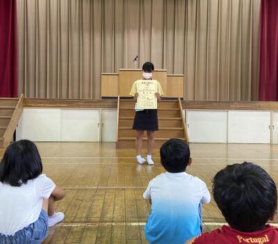 陸上県大会で入賞した選手を紹介し祝福を送った後には、「第2回ブックトーク」で学校代表で発表する2年生。「将棋全国大会岡山大会」と「軟式野球全国大会熊本大会」に出場する3年生・6年生を紹介し、全校生で激励の拍手を送りました。