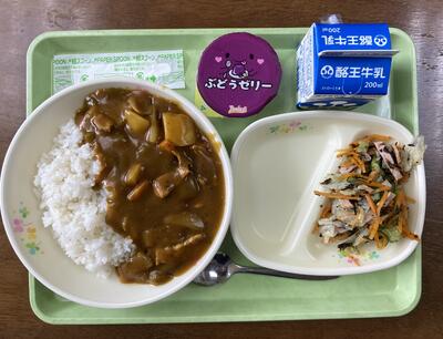 1学期最後の給食は、みんな大好きな「夏野菜カレー」「ひじきサラダ」「葡萄ゼリー」「牛乳」で、大満足の表情で、みんなでおいしくいただきました。ごちそうさまでした!