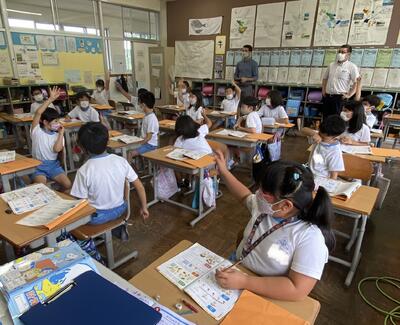 授業では、1年生は国語科でお友達の音読のよさを聞き取っていました。