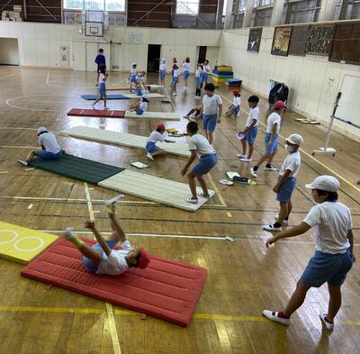 5年生は体育科「マット運動」でした。できる技の確認かな?めあてに向かって安全に進めていきましょう!