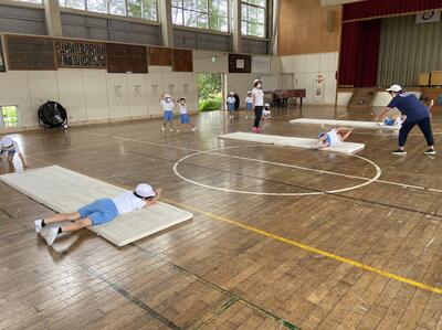 さて、本日、授業を回ると、1年生は体育科で、マット遊びを楽しんでいました。上手に転がっています!