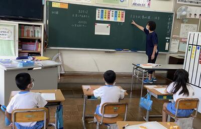 4年生も算数科で何十でわるわり算の学習でした。商の見当をつける考え方を理解していました。大事な学習です。