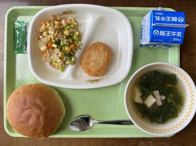 今日の給食は、「丸パン」「海老カツ」「ビーンズサラダ」「中華スープ」「牛乳」でした。ソースも付けて「海老カツサンド」にしておいしくいただきました。ごちそうさまでした!