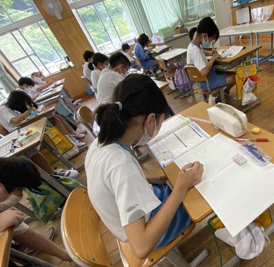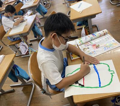 2年生は図画工作科です。身近な夏野菜から楽しい場面を想像して絵を描いていました。皆、楽しそうです!