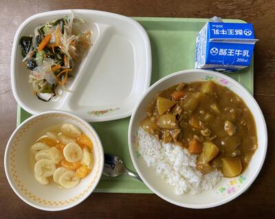 ー今日の給食は、1週間の締めには最高の大人気「カレーライス」に、さっぱりする「海藻サラダ」と子ども達が大喜び「フルーツポンチ」「牛乳」でおいしくいただきました。ごちそうさまでした!